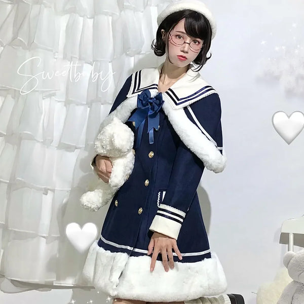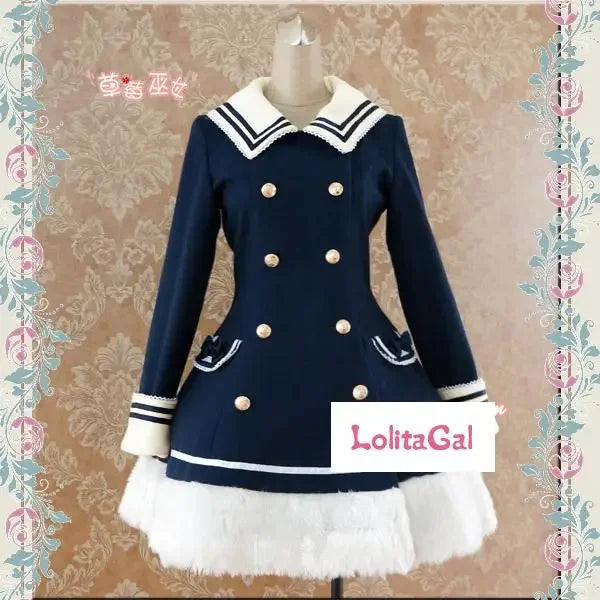 Classis Sailor Uniform Inspired Navy Blue Long Sleeve Double Breasted Metal Button Wool Winter Lolita Coat