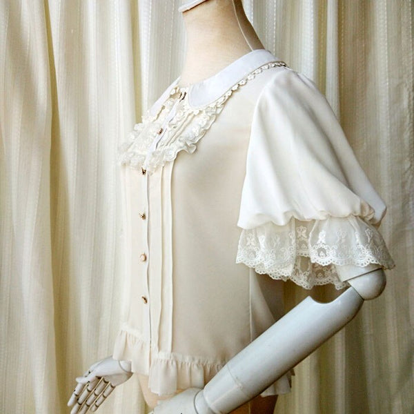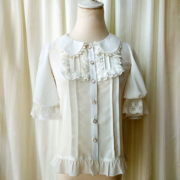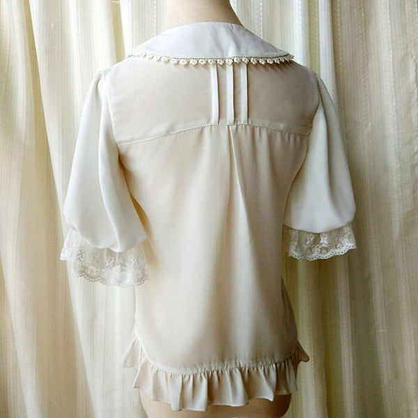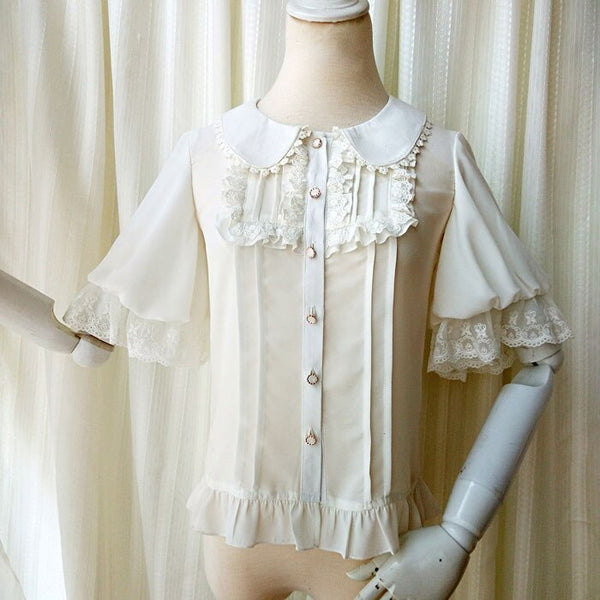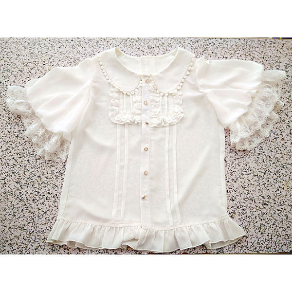 Sweet Short Flare Sleeve Female Chiffon Blouse Peter Pan Collar Button Down Shirt