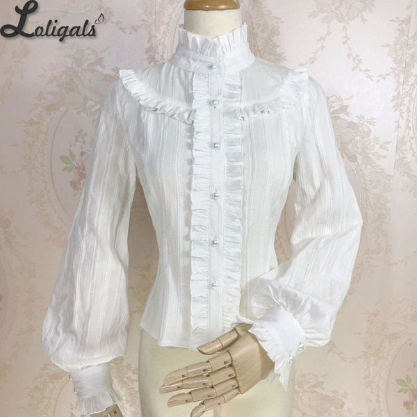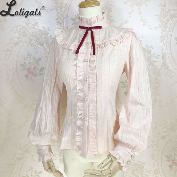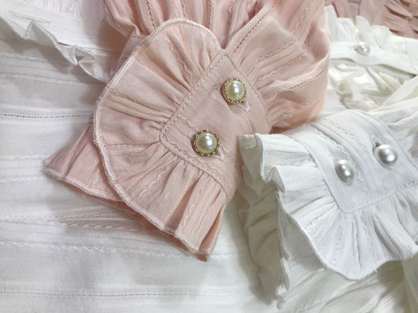 Sweet Women's Lolita Blouse Jacquard Cotton Long Sleeve White/Pink Blouse by Yiliya