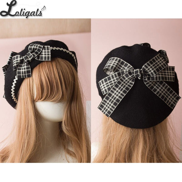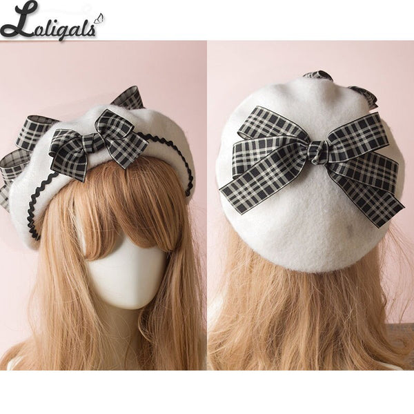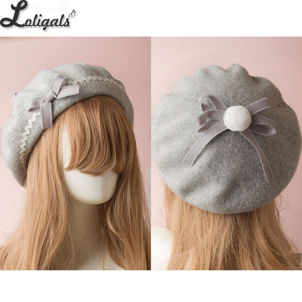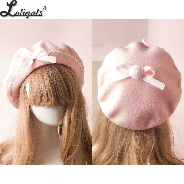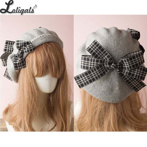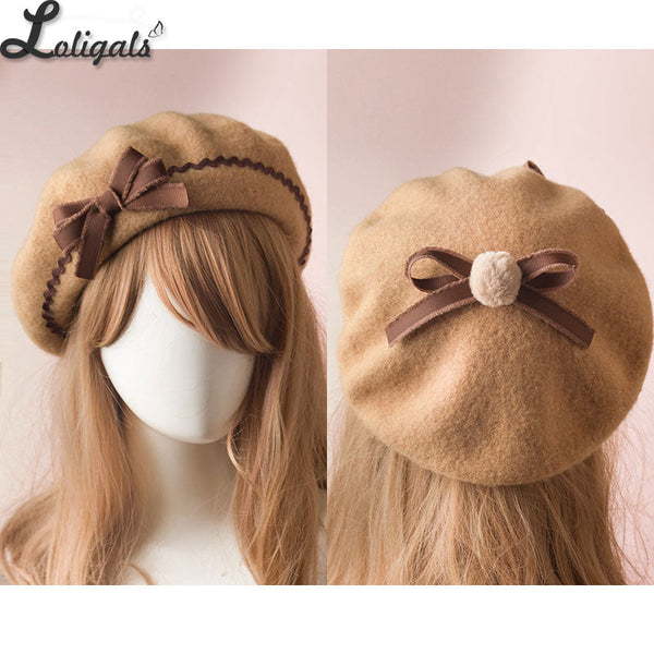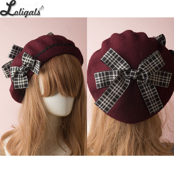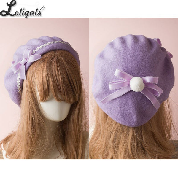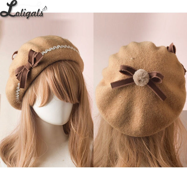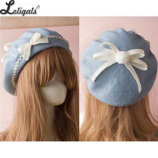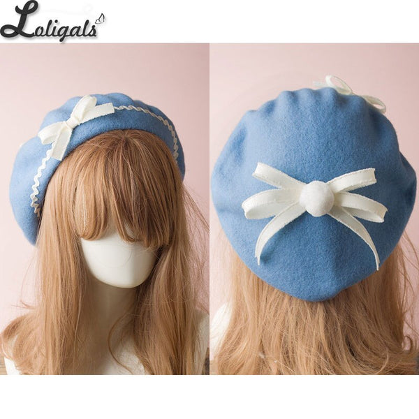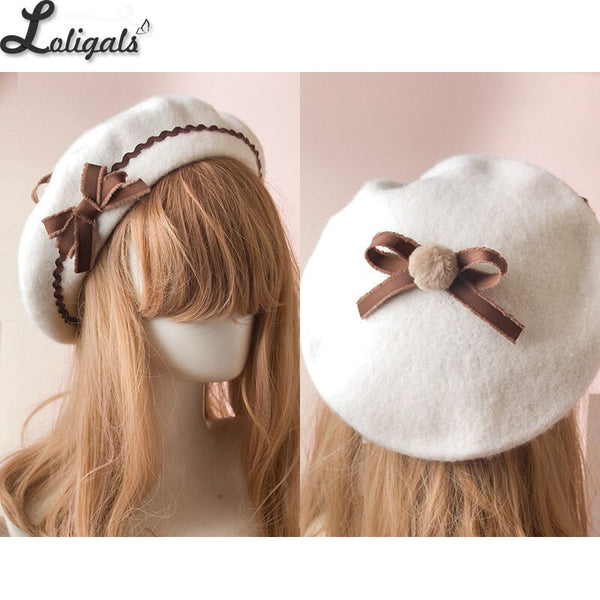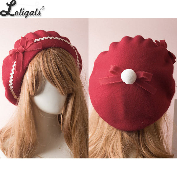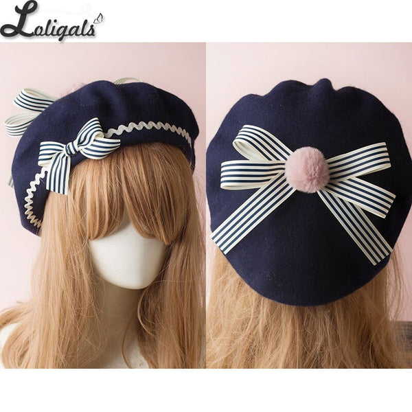 Sweet Women's Lolita Sailor Beret Gothic Wool Beret Hat with Lovely Bows for Winter