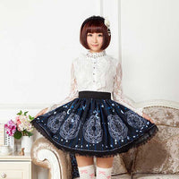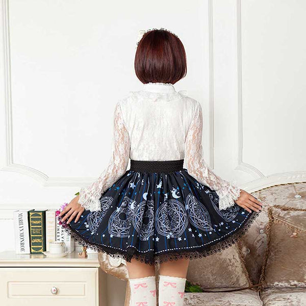 Women's Cute Circle Skirt Deep Blue Star and Moon Printed Short Mori Girl Skirt with Lace Trimming